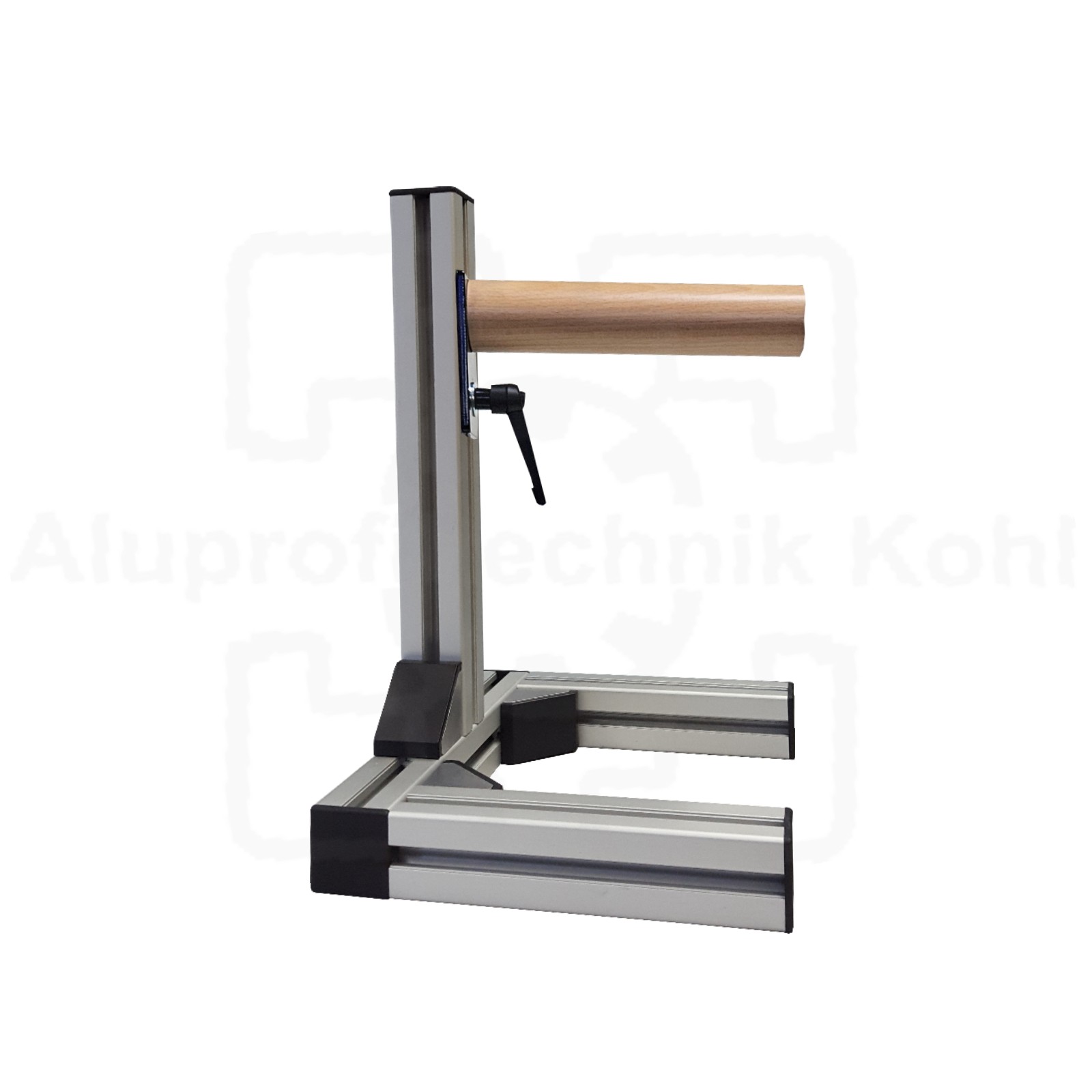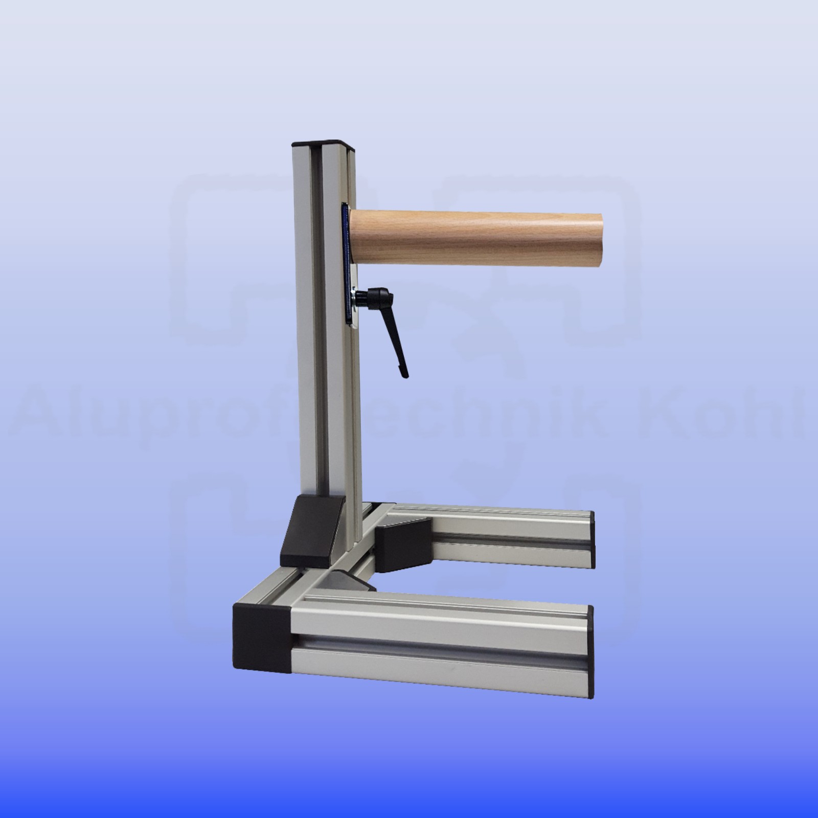 Die Auflage besteht aus Hartholz und wird durch Drehen in der Höhe verstellt.