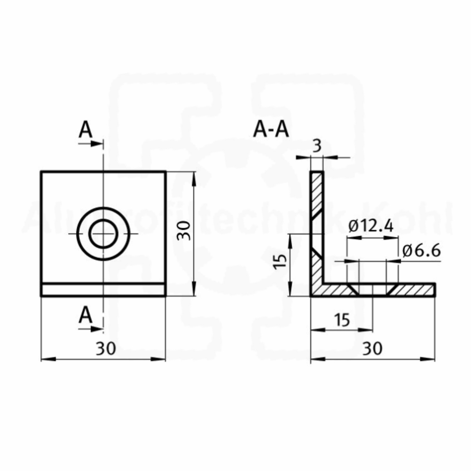Startseite » Zubehör Baureihe 5/6/8 » Profil 30 Nut 6 » Winkel 30 x 30 Stahl alufarbig pulverbeschichtet Eckige Form IP30N6